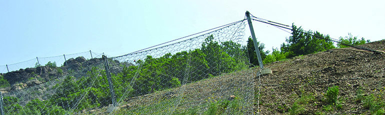 Пассивная противокамнепадная защита. Наши барьеры для смягчения камнепадов (также известные как гибридные барьеры) сочетают функции поглощения энергии динамическим камнеулавливающим барьером и драпировки. Они используются как пассивное сооружение для смягчения последствий камнепада. Не оканчиваясь при закреплении нижним опорным тросом, защитная сетка делается длиннее и перекрывает часть нижележащего склона, где она в состоянии замедлить падение камней.