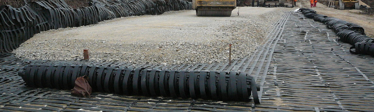 Паралинк: высокопрочный и рентабельный материал. Высокопрочные георешетки Паралинк® или Макгрид® WG обеспечивают высокую прочность при очень низких характеристиках деформации. При использовании в сочетании со сваями могут применяться вместо фундаментных плит насыпи. Георешетки укладываются в один слой на подушку из гравия, которая непосредственно контактирует с оголовками свай. Срок службы георешеток превышает 120 лет. Работая в сочетании с грунтом, они принимают на себя все нагрузки, передаваемые от вышерасположенной насыпи, при этом вертикально нагружая опорные сваи. Наличие георешетки Паралинк® повышает общую надежность насыпи. В результате сваи могут устанавливаться на значительном расстоянии друг от друга, таким образом снижая стоимость проекта.