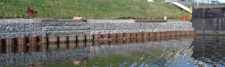 Укрепление крутых берегов, защита от эрозии. Если заложение берега канала очень крутое и его устойчивость нарушена эрозией, необходимо возвести сооружение для закрепления берега и обеспечения постоянной защиты от эрозии. В этих целях используются стены из габионов, выполненных из металлической сетки двойного кручения с шестиугольными ячейками, или системы армирования грунта – система Террамеш®. Крайне важными элементами данной системы является устойчивость и гибкость, а также эффективная защита габиона от коррозии. Обязательным является применение проволоки с прочным гальваническим покрытием, поверх которого наносится дополнительное полимерное покрытие (ПВХ).