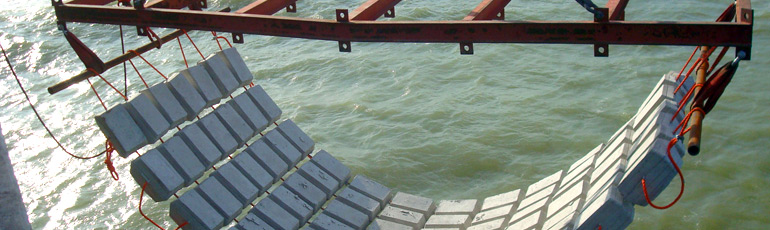 Используемые материалы подбираются таким образом, чтобы обеспечить необходимый расчетный срок службы в морской воде и химическую устойчивость в отсутствие существенного снижения прочности на сжатие бетонных блоков. Подъем УГЗБМ осуществляется с использованием подъемной рамы, которая крепится к крепежным петлям. Высокая степень гибкости матраца позволяет сгибать его без нарушения целостности.